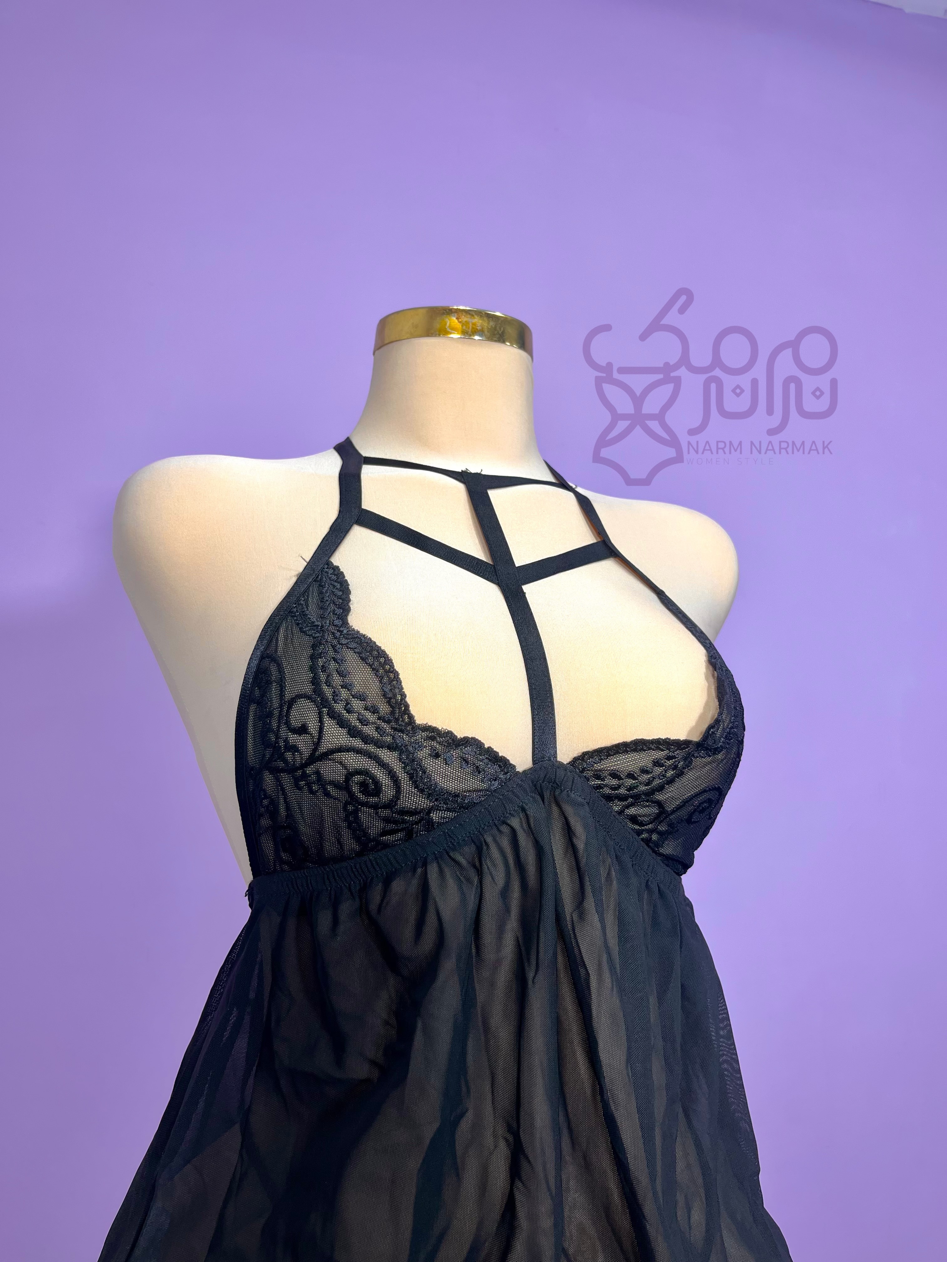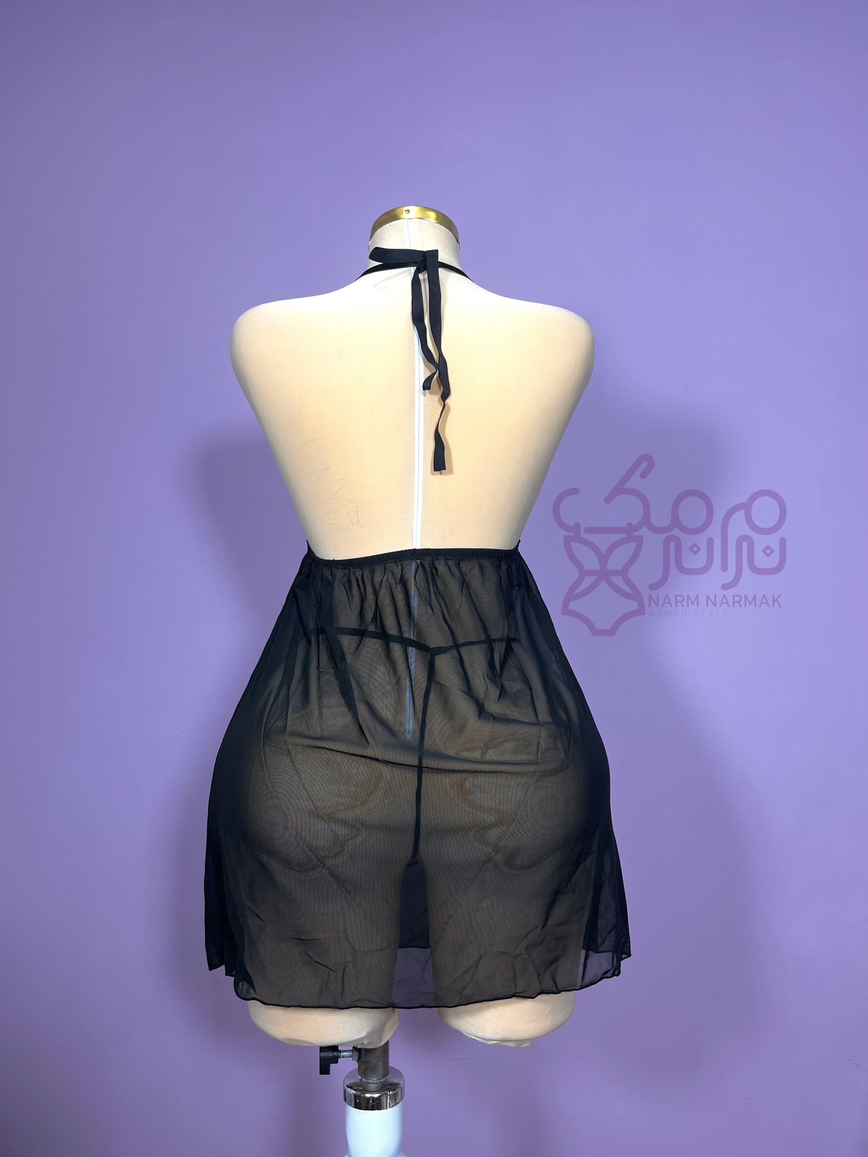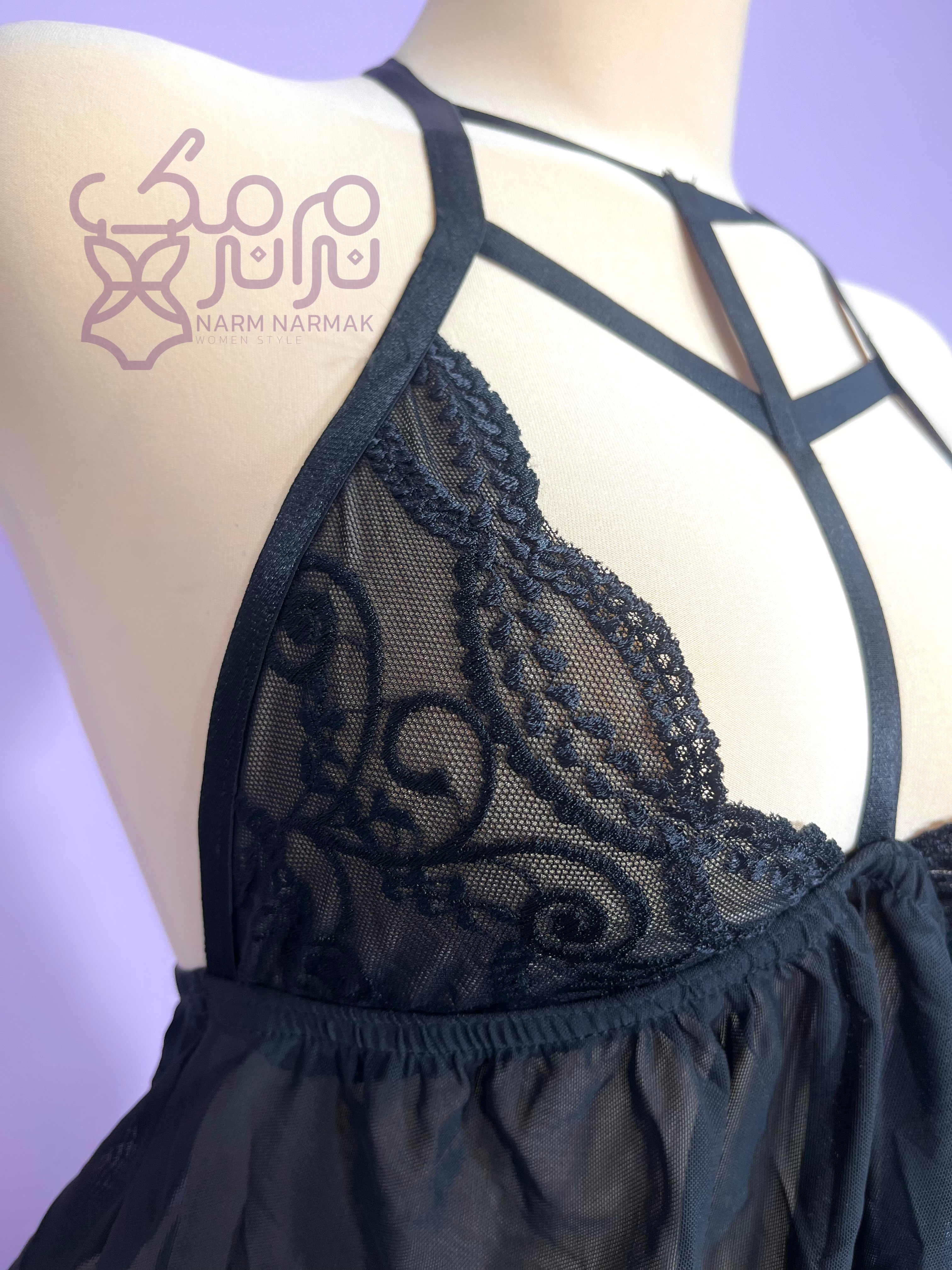 کمر دامنه تور، پشت باز، گیپور روی سینه و بند هارنس، ترکیبی از ظرافت، جذابیت و استایل حرفهای ایجاد کرده. شورت لامبادا هم راحت و هماهنگه.