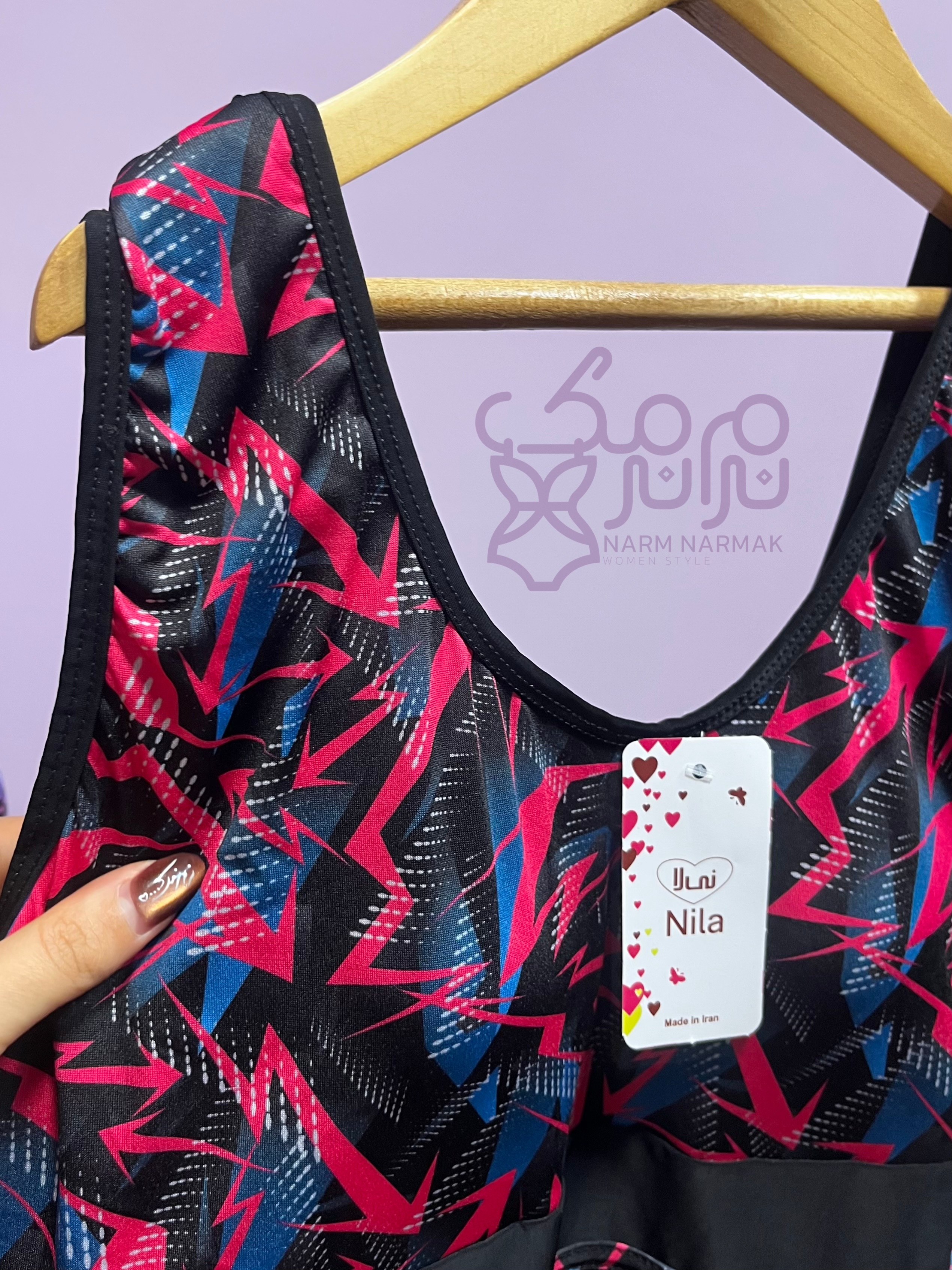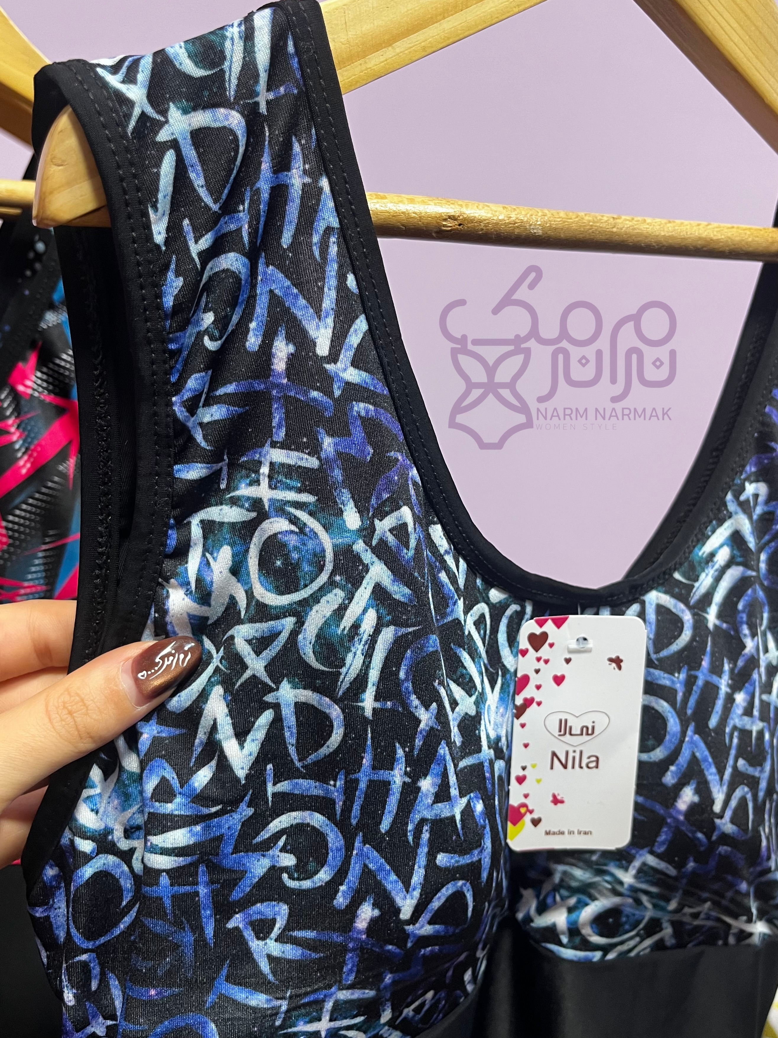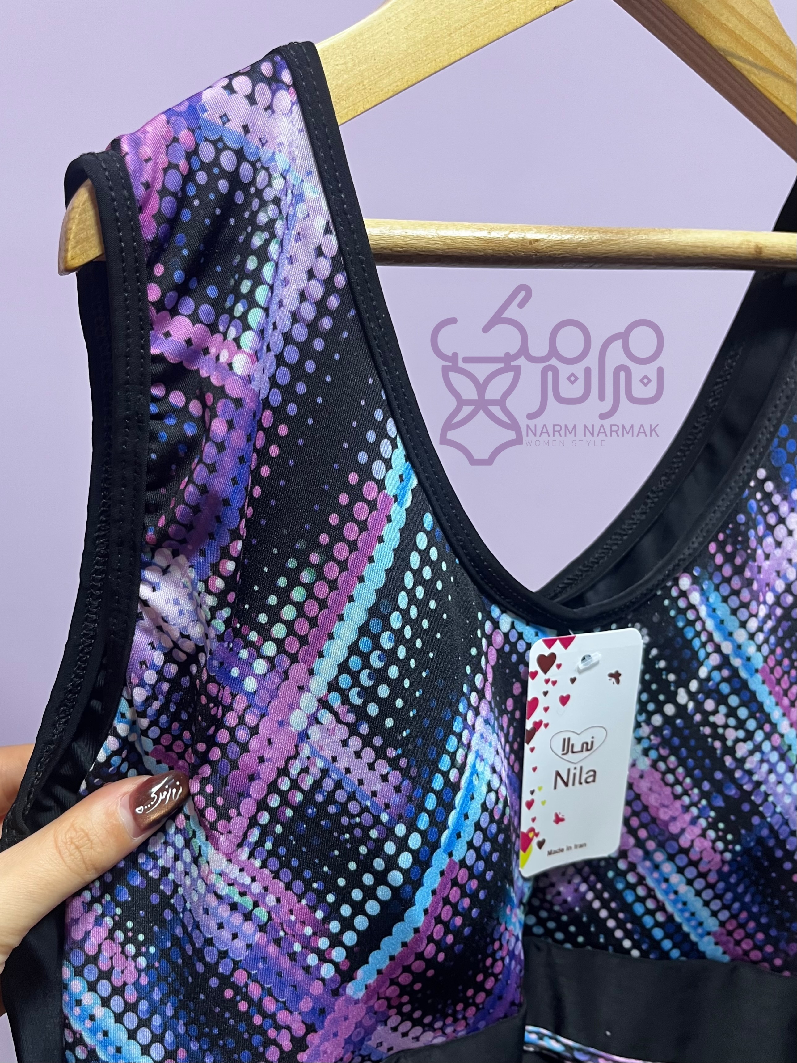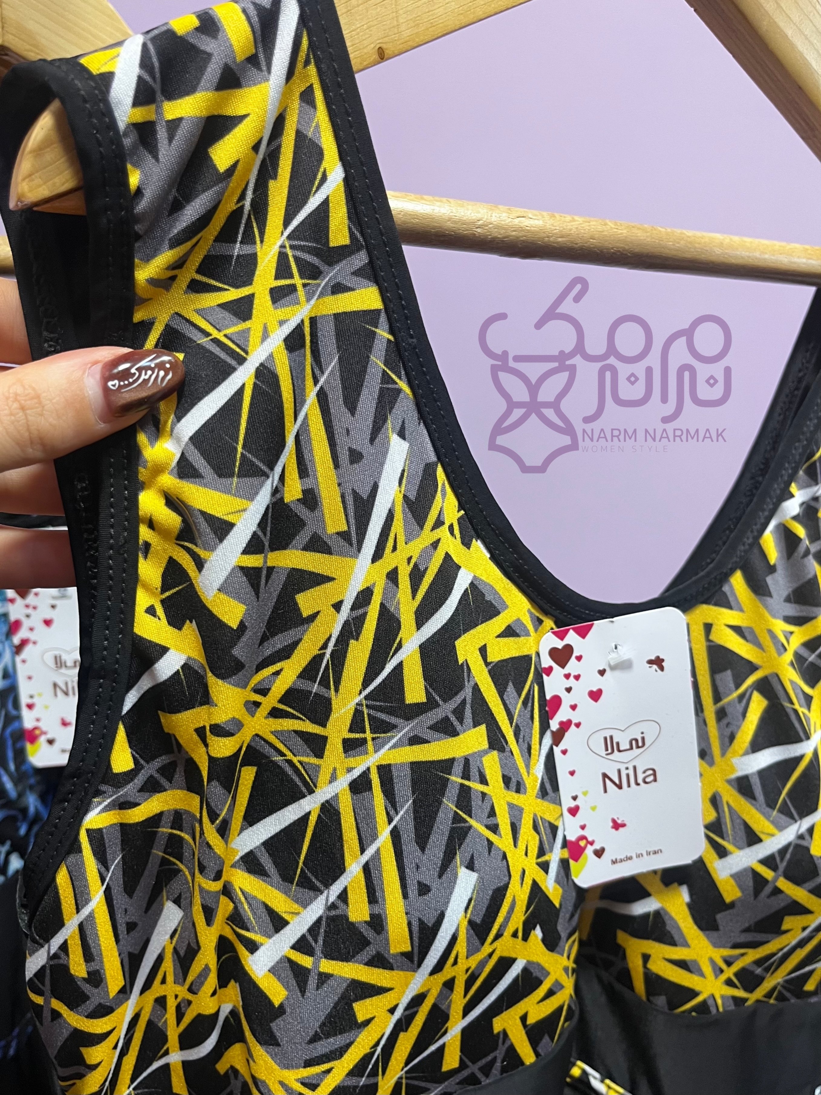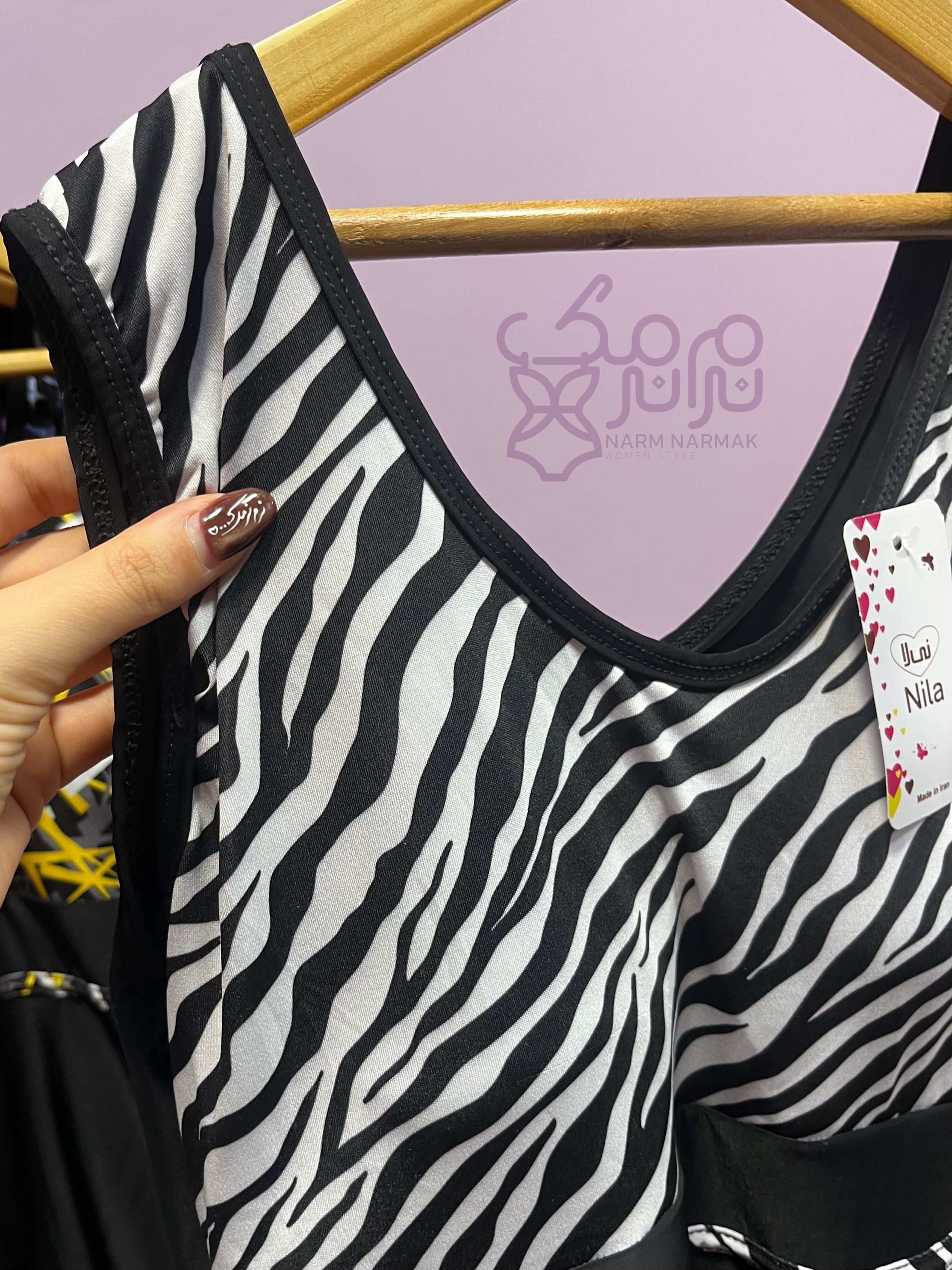 طرح مایو بصورتی است که قسمت پایین تنه و پشت کار مشکی ، قسمت بالاتنه طرح دار که یک نوار از طرح مذکور دور خط کمر استایل شده که به زیبایی و باریک نشان دادن کمر کمک میکند.
