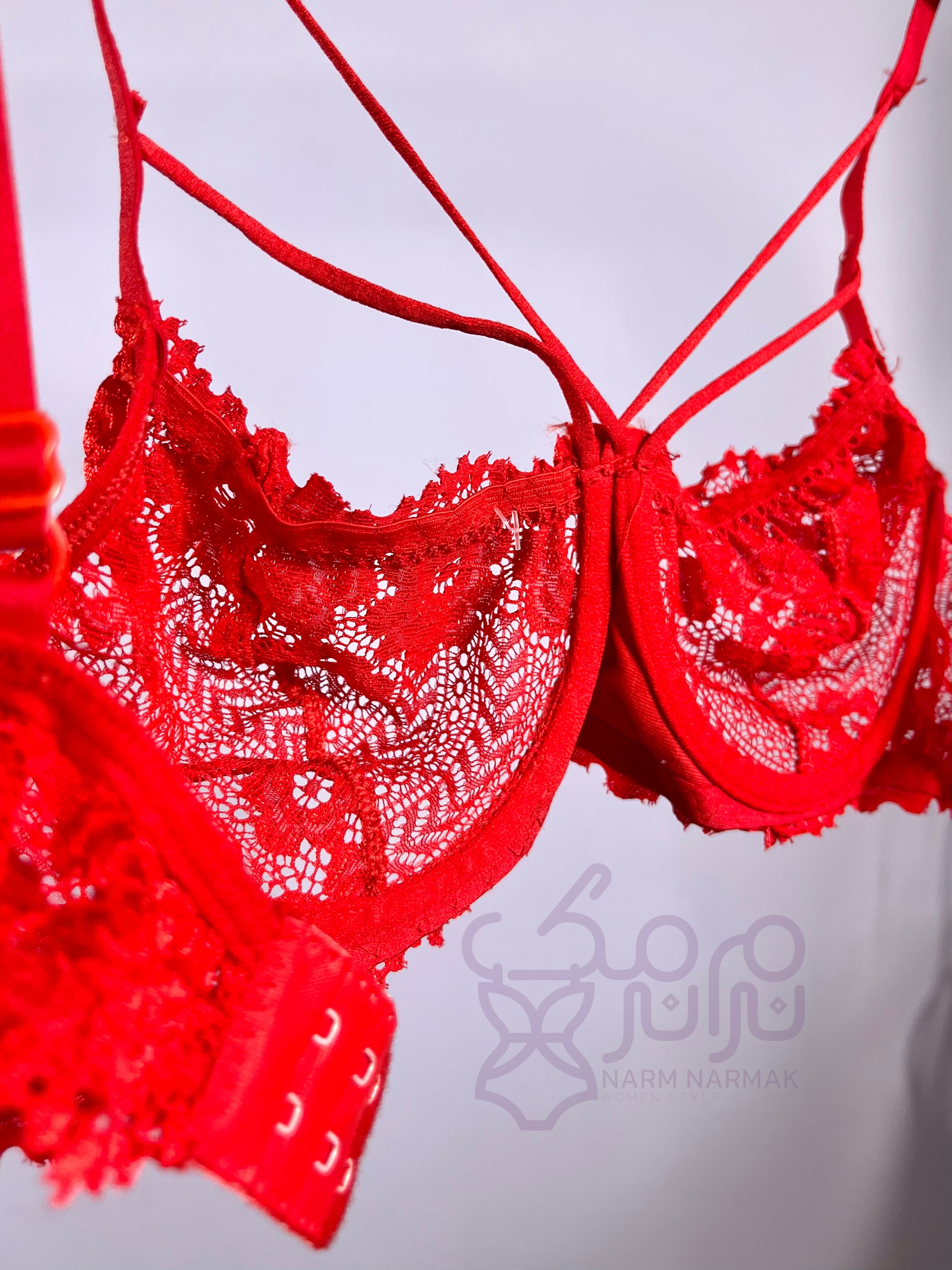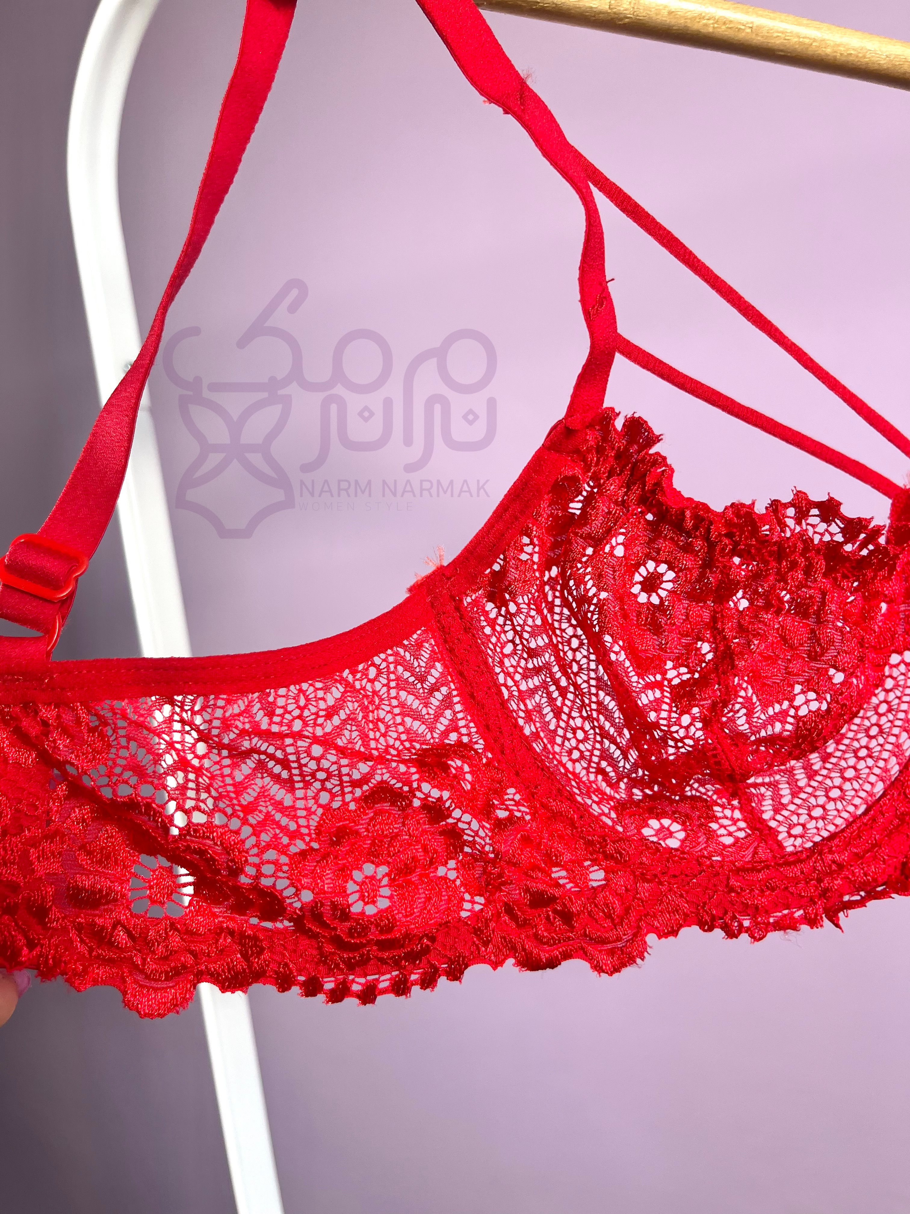 فنردوزی دارد جنس دانتل بسیار نرم و لطیف می باشد لبههای بیرونی کاپ از داخل کشدوزی شده است دارای بندهای هارنسی دو ردیفه