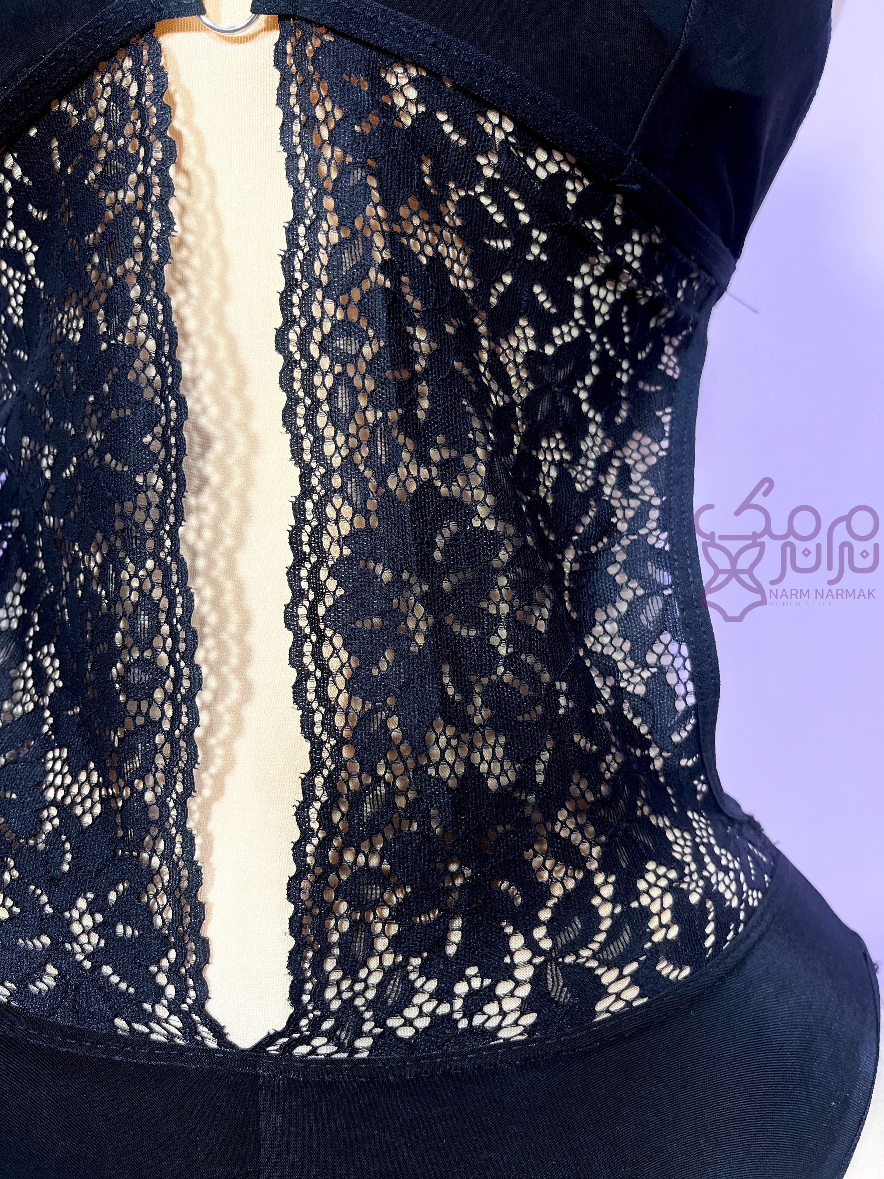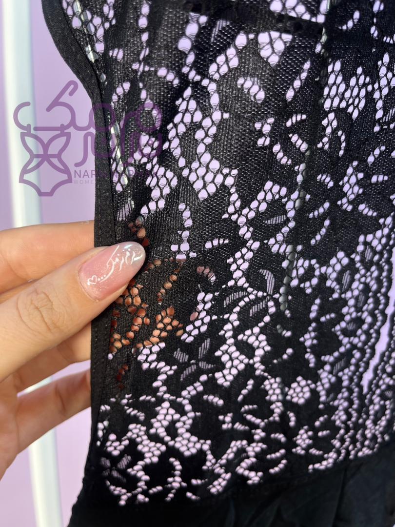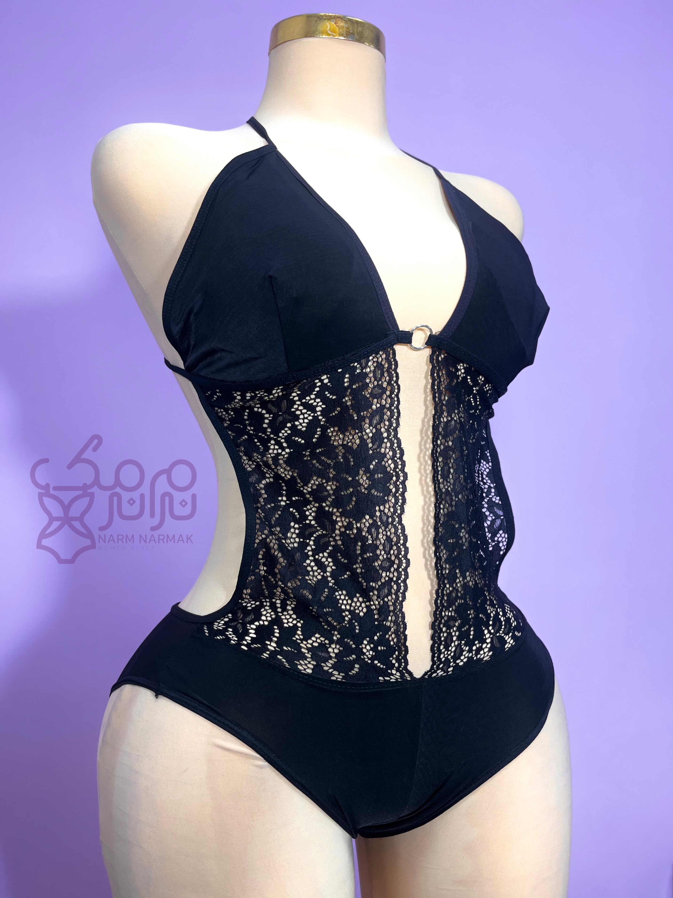 🟣مایو یک تکه زنانه . ترکیب رنگ مشکی و حریر و دانتل جلوه خاصی روی بدن به نمایش می گذارد.